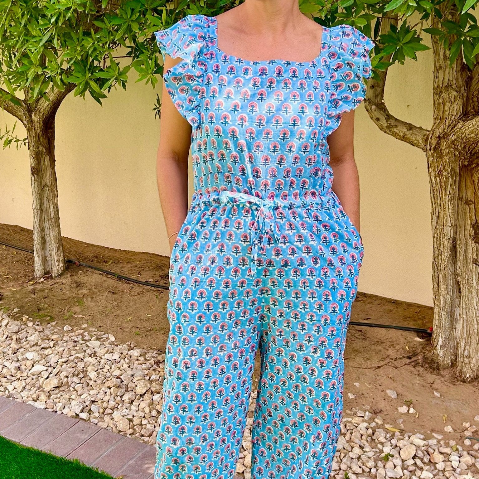 Introducing the mini-me jumpsuit in white with a fun blue with coral flower block printed pattern. Jump into style with frills, drawstring waist, pockets, and balloon pant leg with ankle button. Perfect for twinning with your daughter or just feeling stylishly comfortable, an great alternative to a dress!
